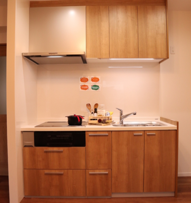 ⇒存在感のある巨大な設備を壁+扉を作り収納、コンロをIHにして快適に