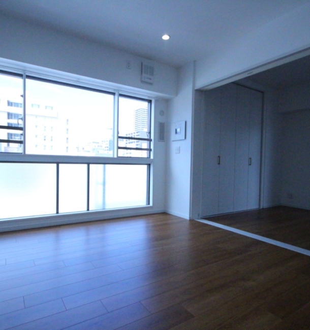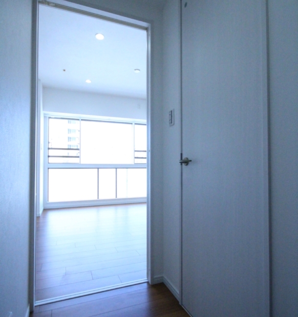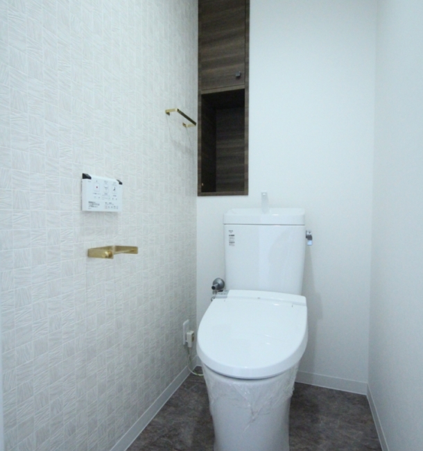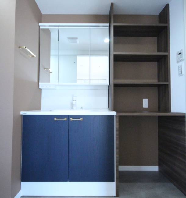ワンルームの小規模工事(水回り設備・内装・建具/床)でしたが、リフォームして新調すると、雰囲気ががらっと変わります。取手やアクセサリー(紙巻き器やタオル掛け)等を真鍮の素材に統一してコーディネートしています。また、洗面室に造作棚を新設し、ランドリーボックスやバスタオルを収納するスペースを作りました。