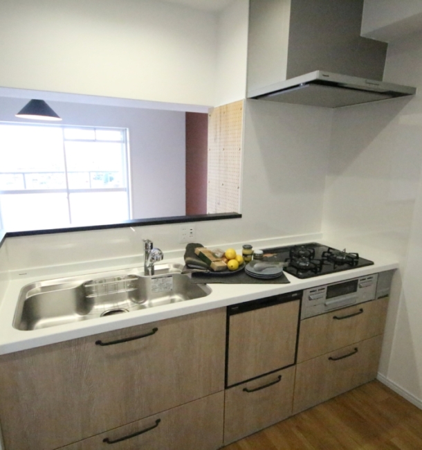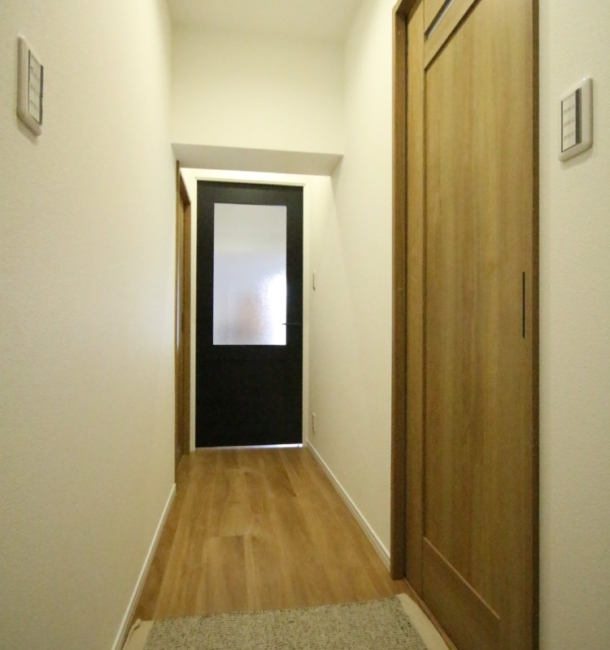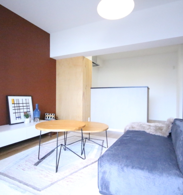 築年数が経っている物件ですが、水回りを海外のアパートの間取りを参考にして洗面室とトイレの間仕切りに腰壁を採用し、狭くなりがちな空間を広く魅せました。(希望があれば、扉を設置することも可能です。)また、キッチンや洋室の間取りも再考し、生活しやすい導線に整えました。