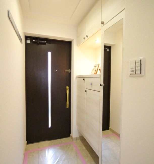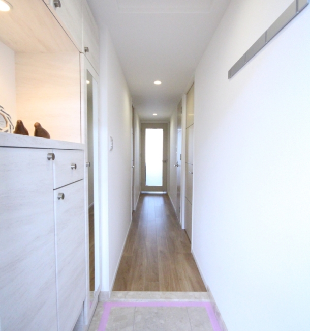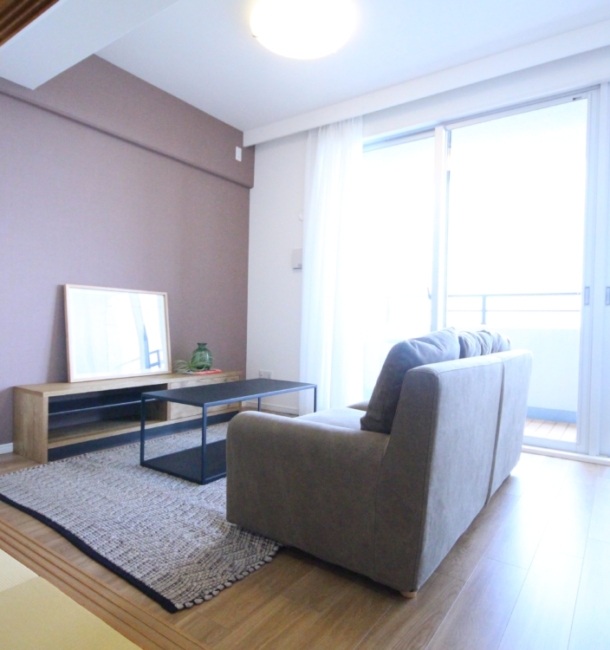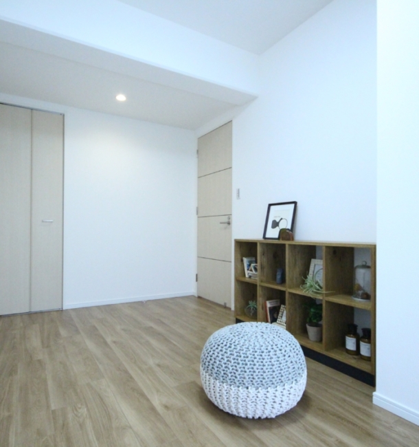 間取りと建具は既存のまま利用し、設備・床材・表装工事をメインにリフォームしました。下駄箱は面材の上からダイノックシートを施工し、装いを美しくすることで、見た目も変わります。また、和室とLDKの壁面を同様の壁紙の色目にすることで空間を広く魅せています。物件は、川辺に建っているので、見晴らしも最高です。